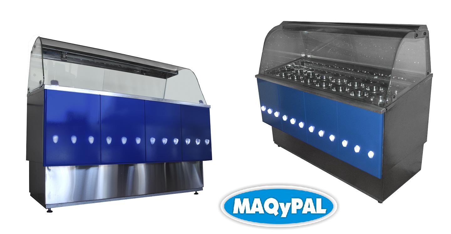 Descripción: Estructura en chapa de acero inoxidable, evaporador estatico, equipo 1/4 hp, bols de acero inox o vidrio, frente decorado con iluminacin, heladera inferior con puertas traseras, modelos 1 mt y 1,5 mt.