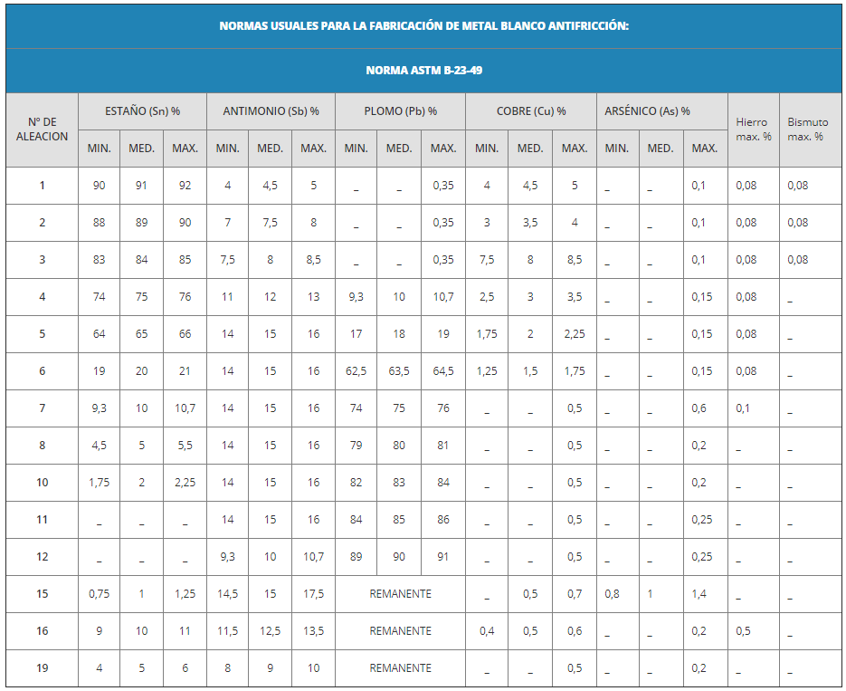 Descripción: Fundi Serber S.R.L. fabrica una serie de composiciones de metal blanco para cojinetes de alta calidad y resistencia. Dichas aleaciones están formuladas bajo normas ASTM, DIN, SAE. METAL BLANCO A: Esta aleación se emplea para trabajos forzados y en altas velocidades como así también para temperaturas elevadas; se puede utilizar para velocidades superiores a las 2.000 r.p.m. con cargas extremadamente altas y gran resistencia a la compresión, se usa para motores diesel marinos, turbinas, maquinas de vapor. METAL BLANCO B: Esta aleación se emplea donde las velocidades superan las 2.000 r.p.m. con cargas medianas y temperaturas superiores a las 70ºC. Se utiliza para motores a explosión de grandes y bajas potencias ya sea de 2T como de 4T, motores eléctricos, ventiladores, forzadores y todo tipo de maquina industrial con media velocidad. METAL BLANCO C: Este metal se emplea donde las velocidades no superan las 1.500 r.p.m. y con cargas extremadamente altas. Se utiliza para maquinas pesadas, molinos, ascensores, moliendas, vagones, válvulas y todo tipo de maquina industrial donde las velocidades no son extremadamente altas. METAL BLANCO D: Este es el mas económico de todos los metales blancos, pero dadas sus características físicas se emplea para maquinas pesadas con bajas velocidades no pasando estas de las 700 r.p.m. hasta 90ºC.